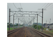 中でも、昭和34年7月27日~31日に行われた「こだま高速度試験」では、31日に東京起点202K付近(藤枝・瀬戸踏切)で、狭軌最高速度163Km/hを樹立。事実上、東海道新幹線で計画していた210Km/hが可能であることを証明しました。まさに、”新幹線の原点”です。 ![]() 第三線 その後、藤枝市内上青島地区に、上り線の北側に路床を拡幅し、東海道新幹線に使用予定の、PC枕木、ロングレール、架線、路床構造を敷設した「第三線」が完成。昭和35年11月21日には「集電試験」中に175Km/hという記録が出ました。